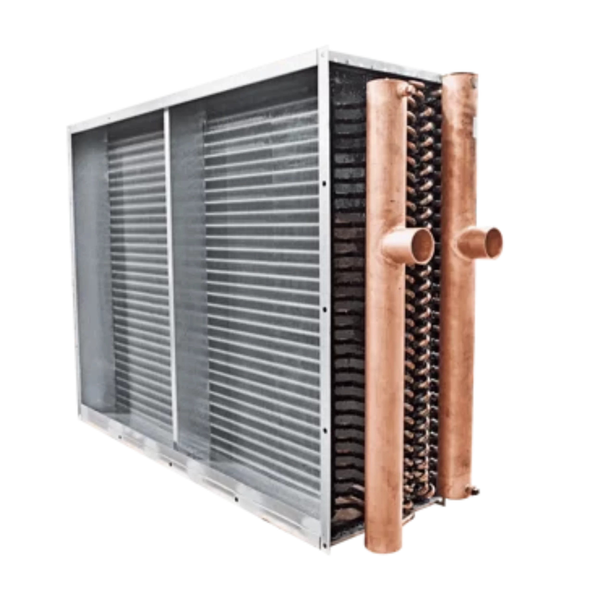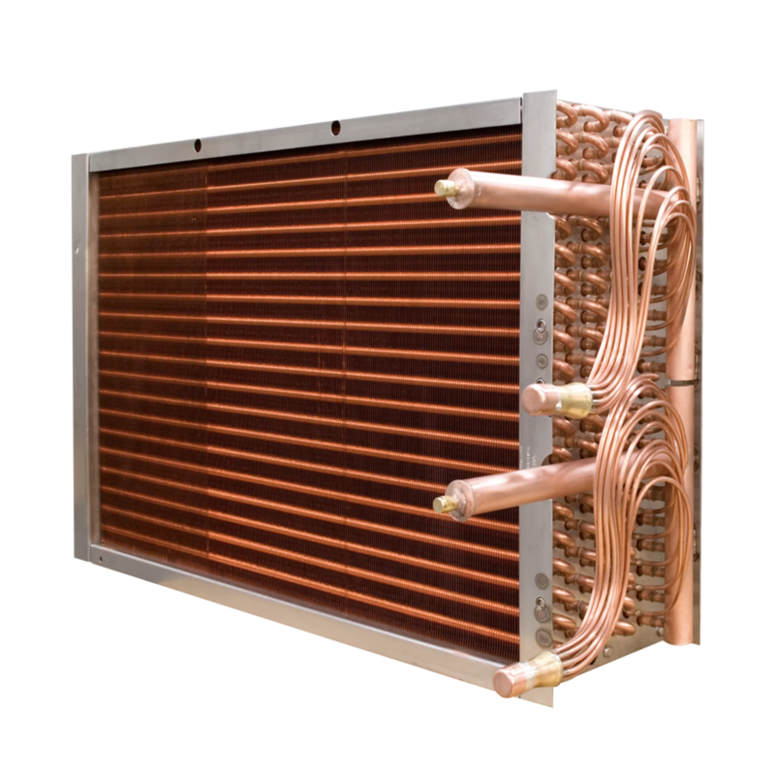 Serpentines para refrigerante o agua helada fabricados con tubos de cobre y aletas de aluminio, también disponibles en acero inoxidable.